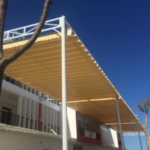 – Diện tích che phủ rộng: có thể từ 10m2 đến 1000 m2 , mái xếp vẫn dễ dàng di chuyển nhanh chóng. Vì vậy rất phù hợp cho những quán ăn, nhà hàng, khu vui chơi, khu du lịch, hồ bơi, quán café … có không gian kiến trúc mở.